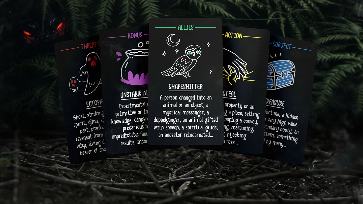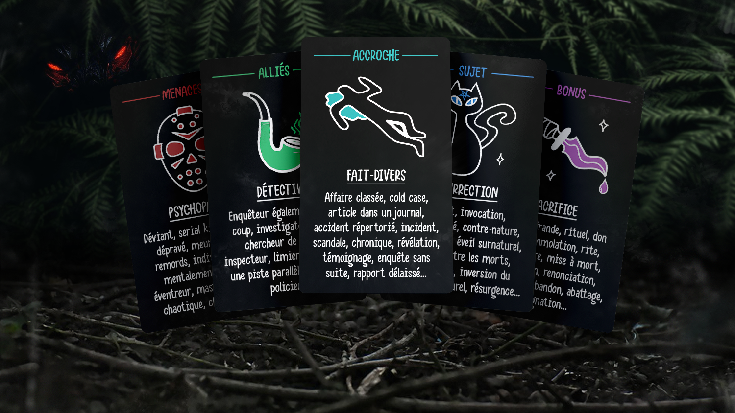 Pour commencer à créer votre scénario, piochez une carte de chacune de ces catégories :